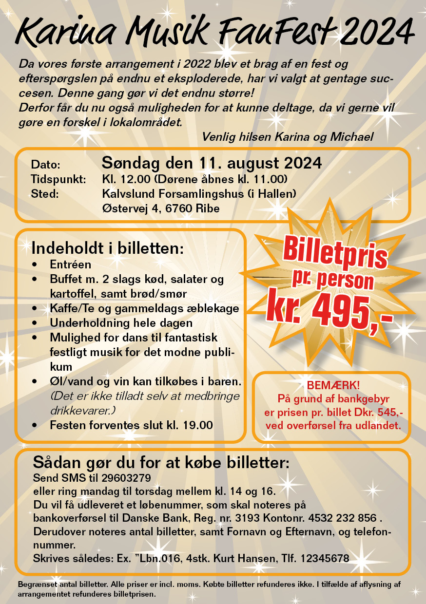 På grund af bankgebyr er prisen pr. billet DKK. 545,- ved overførsel fra udlandet.